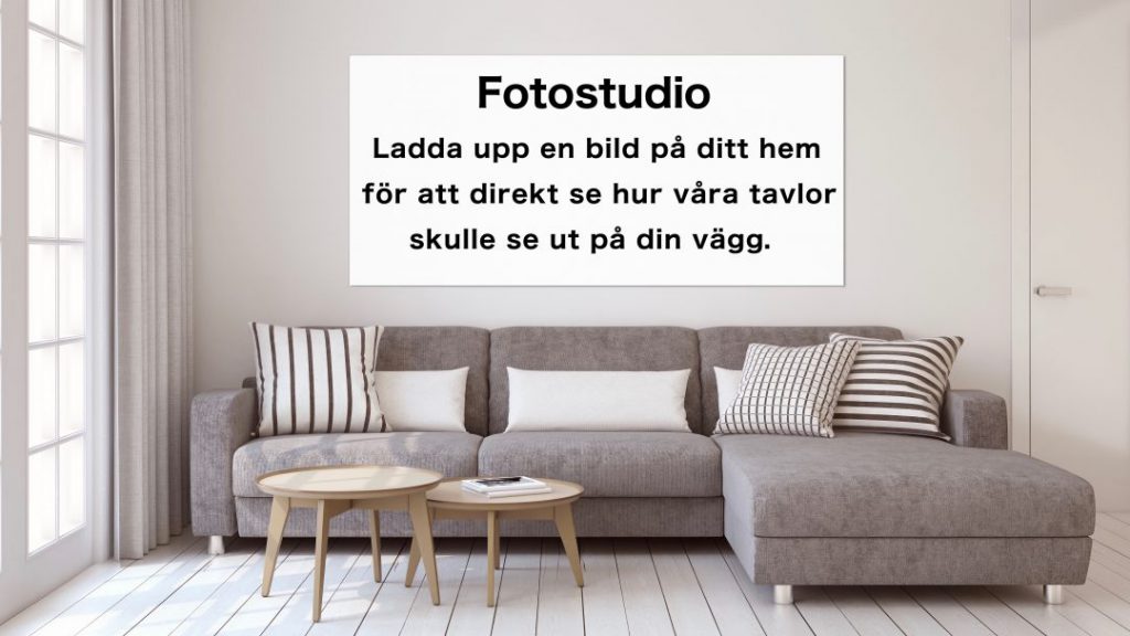 Undrar du hur våra konstverk skulle se ut i ditt eget hem? Ladda upp en bild ifrån ditt hem och se direkt hur våra tavlor skulle se ut på din egen vägg. Du kan också bläddra bland våra bilder för att se hur en tavla ser ut i olika miljöer. Är du på jakt efter nya tavlor till vardagsrum, sovrum eller kök. Nu kan du hitta en snygg tavla ifrån oss och enkelt ”montera” den på väggen i vår fotostudio. Du får då en väldigt bra känsla över hur färgerna på tavlan matchar de andra färgerna du har i hemmet. Så prova i lugn och ro innan du bestämmer dig för att köpa tavlor på nätet. Snabbt, tryggt och enkelt – dina nya tavlor köper du hos oss på Konstlagret.