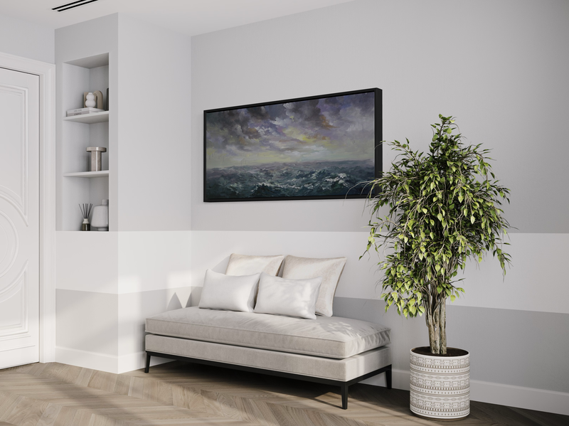 Et håndlaget maleri på lerret, klar til å henge på veggen.