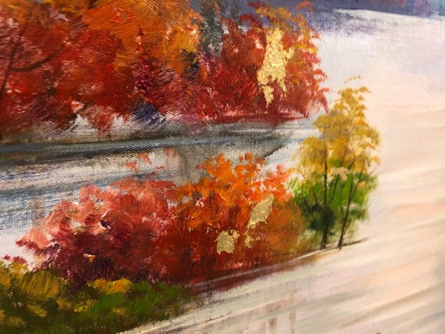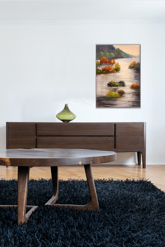 En handmålad tavla på canvas uppspänd på träram, färdig att hängas på väggen.