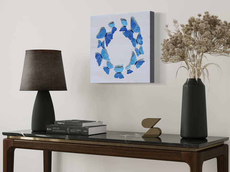 Med den här tavlan har konstnären låtit sig inspireras utav härliga blåa fjärilar. Att använda sig utav djur och blommor när man målar har alltid varit populärt både hos konstnärer och konstälskare. En blomma eller ett djur som motiv i en akrylmålning eller oljemålning kan man lätt göra färgglad och lekfull utan att det blir onaturligt. Ett landskap, hav, marinamiljöer eller segelbåtar kan också verka förtrollande och väcka känslor hos betraktaren. Konst är ett enkelt sätt att få fantasin att leka medan man egentligen bara kanske står och tittar djupt in i en tavla. Även en hund, katt, häst eller fåglar är härligt motiv för tavlor och vilda djur som lejon, elefant och noshörningar tycker många är fascinerande som konst på väggen.