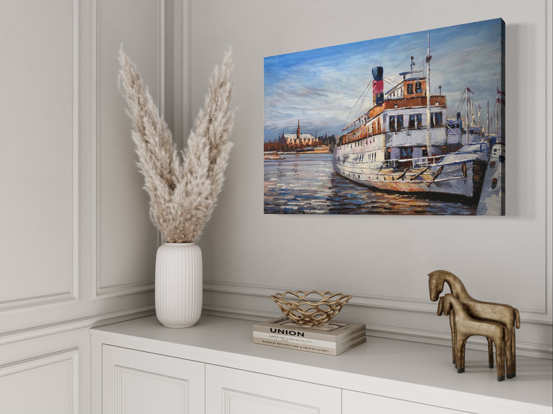 Med den här tavlan har konstnären låtit sig inspireras utav Stockholms djurgårdsfärja. Ett landskap, hav, marinamiljöer eller segelbåtar kan också verka förtrollande och väcka känslor hos betraktaren. Konst är ett enkelt sätt att få fantasin att leka medan man egentligen bara kanske står och tittar djupt in tavla.