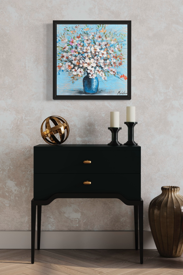 En handmålad tavla på canvas uppspänd på träram, färdig att hängas på väggen.